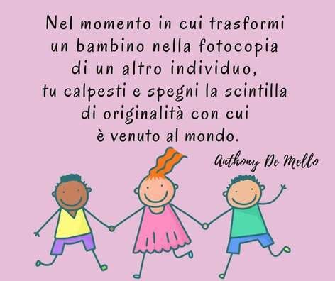 “Nel momento in cui trasformi un bambino nella fotocopia di un altro individuo, tu calpesti e spegni la scintilla di originalità con cui è venuto al mondo”. Anthony de Mello.