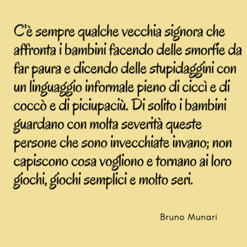 “C’è sempre qualche vecchia signora che affronta i bambini facendo delle smorfie da far paura e dicendo delle stupidaggini con un linguaggio informale pieno di ciccì e di coccò e di piciupaciù. Di solito i bambini guardano con molta severità queste persone che sono invecchiate invano; non capiscono cosa vogliono e tornano ai loro giochi, giochi semplici e molto seri“. Bruno Munari.